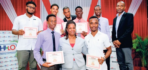 Scholarship recipients of the Bruce Rickards Scholarship, which is given to past students of Kingston College, are joined by Madame Hall, French teacher at Kingston College (front row, cenre) and Dave Dacosta, VP of digital marketing and communications, First Global Bank (back row, right).
